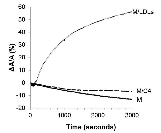 圖4。單層(M)所覆蓋的界面的相對表面積隨時間的變化,該單層(M)以25 mN/M的速度壓縮,并在不含任何額外分子(-)的緩沖液上形成,(…)LDL(4.6 mg PC)和(-)脂質體C4(含4.8 mg PC)。空氣-緩沖界面處的溫度為34℃。