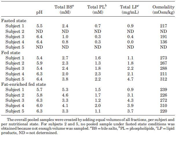 攝入Sure Plus1或Scandishake Mix1后前2小時的滲透壓通常高于禁食狀態下的HIF,盡管禁食狀態和兩種喂食狀態之間未達到顯著差異。禁食狀態滲透壓值一般為低滲透,或接近等滲透值。224 mOsm/kg的總體中值為低滲透性,與Brouwers等人1和Deferme等人報告的人類十二指腸吸出物的平均滲透壓一致。,38但高于Perez de la Cruz Moreno等人報告的平均值。24在給藥(n?3)后,在混合樣品中獲得的滲透壓較低,與Kalantzi等人11和Gisolfi等人報告的滲透壓較好。39在喂食和富含脂肪的喂食狀態下均發現高滲值,尤其是在消化的前3小時。在喂食和富含脂肪的喂食狀態下,總的中位數滲透壓為等滲透壓(分別為285和278 mOsm/kg)。進食后180分鐘內較高的滲透壓與膽汁鹽濃度、磷脂或脂質產物總量無關。Kalantzi等人19將吸入十二指腸內容物的高滲值歸因于雙糖和果糖復合碳水化合物的存在,以及后者的緩慢吸收。在本研究中未確定總碳水化合物水平,因此,該陳述無法驗證。