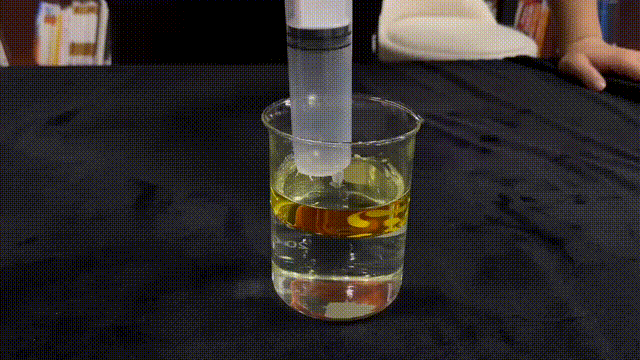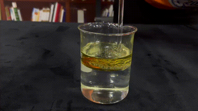 那我們來換一組界面看看:由于空氣與水或者油的界面張力不足,所以如果向水或者油中打入空氣,氣泡的浮力大于界面張力,氣泡便難以留在燒杯中。