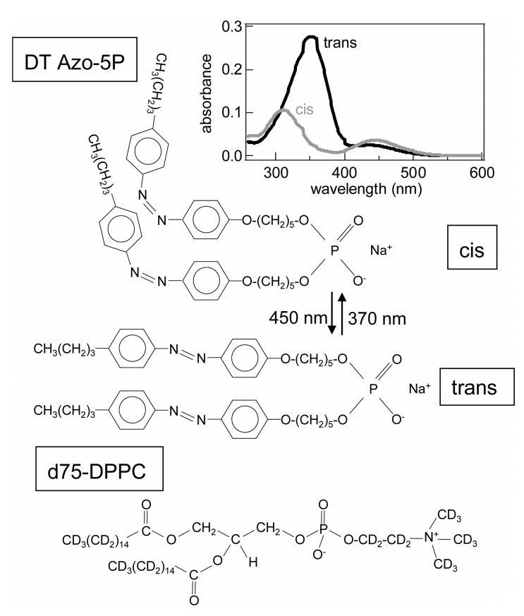 圖1:。順式和反式構型的光開關脂質DT Azo-5P和d75 DPPC的分子結構。右上角的插圖顯示了CHCl3中DT Azo-5P的紫外/可見光譜(~在370 nm(順式)和450 nm(反式)下輻照約10 s后,使用7μM,1 cm反應杯)。