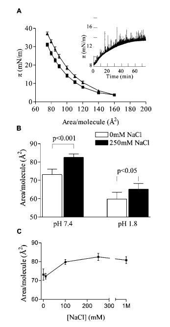 圖1:。NaCl對PIP2單分子膜的擴張效應。(A)π-含0 mM(9)和250 mM NaCl(2)的等溫線;(插圖)亞相注入250 mM NaCl(時間)0時,恒定面積/分子的表面壓力變化。(B)在pH 1.8(n)7)和pH 7.4(n)5)條件下,30 mN/m的每個分子的面積。(C)對亞相NaCl的劑量反應。誤差條為平均值(n處為SE)5,除非另有說明。所有數(shù)據(jù)均為HEPES緩沖亞相的L-R PIP2,pH 7.4(除非另有說明),30°C。