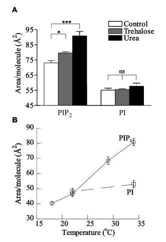 非離子液晶和溫度的膨脹效應。為了驗證單價鹽破壞PIP2頭基之間有吸引力的氫鍵相互作用的假設,部分克服了高頭基電荷密度預期的靜電排斥作用,測試了幾種非離子超嗜性因子破壞這些假定網(wǎng)絡和誘導單層膨脹的能力。尿素是一種因其潮向性而常用的蛋白質(zhì)變性劑,海藻糖是一種非還原性葡萄糖二聚體,因其破壞水結(jié)構(gòu)的能力而具有低溫保護特性,對其對PIP2單層的影響進行了測試。與通過氫鍵的吸引相互作用相一致,兩種非離子超取向?qū)畏肿幽ざ加泻軓姷呐蛎浶T讦校?0 mN/m時,5 m尿素使每個PIP2分子的面積增加了近25%,達到90.9?2/分子,這是在這些實驗中所采用的任何條件下觀察到的最高值(圖4b)。同樣,5 mM海藻糖顯著增加PIP2單層的面積9%。這些作用對PIP2有特異性,因為兩種處理對PI的單層都沒有顯著影響。