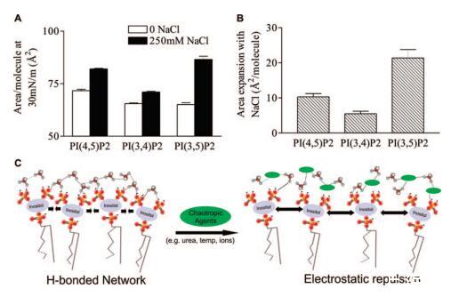 為了確定PIP2特異性膨脹是否主要由大塊肌醇環(huán)引起,同時控制酰基鏈組成,用磷脂酰肌醇4-磷酸(LR PI(4)P)和磷脂酰肌醇(LR PI)重復壓力面積等溫線。由于這些分子是細胞中酶促PIP2生成的前體,它們的脂肪酸組成與PIP2相似或相同,只是在肌醇環(huán)上的磷酸取代程度不同。與PIP2一樣,兩種肌醇基脂質(zhì)均未觀察到相變,平均分子面積隨著磷酸取代度的增加而增加,與之前的觀察結(jié)果一致。29然而,盡管單磷酸鹽PI(4)P與二磷酸鹽PIP2表現(xiàn)出相同的趨勢,但PI和PI(4)P均未表現(xiàn)出對NaCl濃度增加的顯著擴張,表明類似但小得多的影響(圖2b)。這些數(shù)據(jù)表明,NaCl誘導PIP2單分子膜擴張的機制與其他陰離子以及其他肌醇基脂質(zhì)相比,是PIP2特有的。