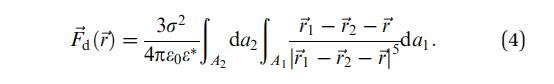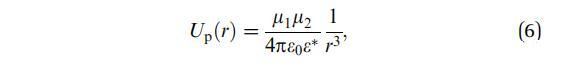 其中Ai表示域i的面積,dai表示其面積元素,-ri表示其相對于域中心的位置向量,i=1,2-r是從域1中心到域2中心的向量,如圖1所示。e0是真空介電常數(shù),ew和ea分別是水和空氣的相對介電常數(shù)。在這里,我們使用了Urbakh等人21的研究結果,該研究描述了由兩個半無限介質包圍的薄電介質層中偶極子之間的相互作用。
