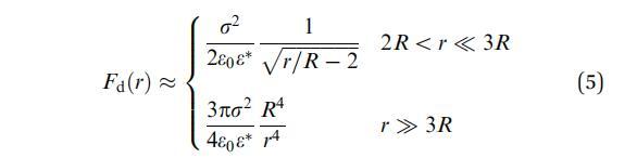 圖2顯示了兩個半徑相等的圓形區(qū)域的Fd(r)(實線)和Fp(r)(虛線)。疊加在等式(4)的數(shù)值解上,我們添加了等式(5)(虛線)的短距離的漸近表達式。注意,當兩個域接近接觸(r=2R)時,F(xiàn)d發(fā)散,而Fp保持有限。此外,對于實驗感興趣的范圍2R o r o 10R,兩個力之間的差異是可觀的。特別是,即使r=5R,差值也在15%左右。