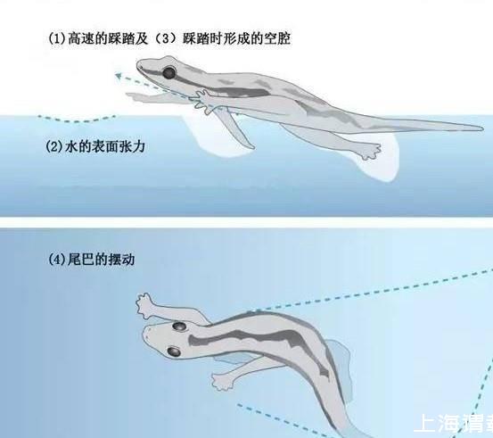 這種壁虎有大約6克重,相比于水黽來(lái)說(shuō)它確實(shí)重多了,這似乎不具備利用水表面張力的能力。但壁虎有辦法,它有一身超級(jí)防水的皮膚和帶蹼的腳掌,通過(guò)四條腿大力拍擊水面,壁虎在它身體下方制造一個(gè)空氣的空腔,這時(shí)候水的表面張力會(huì)因?yàn)橛谢謴?fù)曲率最小化的趨勢(shì),從而將壁虎的身體向上方推。與此同時(shí),壁虎扭動(dòng)他的身體和尾巴,尾巴像一支船櫓一樣驅(qū)動(dòng)壁虎以1米/秒的速度在水面飛奔。