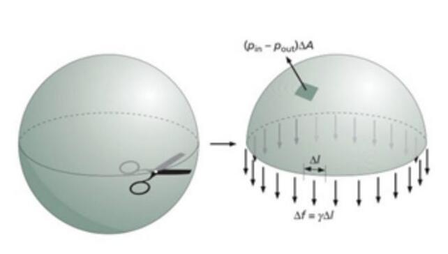 比如說,無重力液滴是一個球形。我們對一個這樣的液滴的上半球做一個受力分析,它受到三個力的作用:
