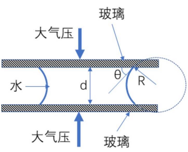 我們可以想象,當(dāng)兩片玻璃間隙非常小的時候,這個凹液面的曲率就會非常大,在這個時候,液體壓力與大氣壓的差就會很大,因此把玻璃擠壓在一起的力也就很大。我們可以用楊-拉普拉斯公式來估算一下。