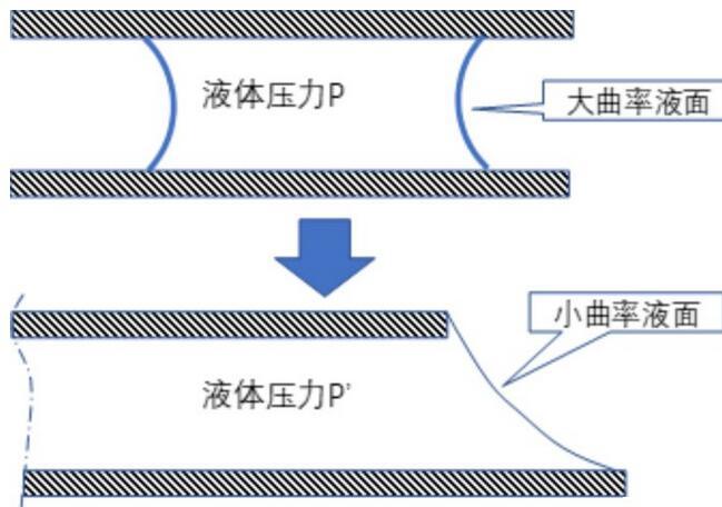 但是當(dāng)我們向著玻璃縫隙滴幾滴水,哪怕只是很少的幾滴,它們之間就不再牢固了,隨著水的不斷滴入,最后就不可避免地分開了。這是因?yàn)榈稳胨粩噙M(jìn)入縫隙,最后就會破壞掉前面所述的曲率很大的液面,導(dǎo)致液體壓力與外界氣壓的差迅速降低,于是它們就無法繼續(xù)沾在一起了。這個過程可以圖示如下: