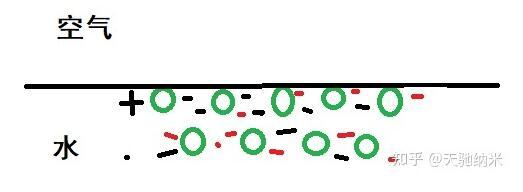 但是問題來了。水面的這一排分子,上面沒有水分子了。于是對著空氣的這一面,電荷沒有辦法被抵消了。于是電荷就開始亂七八糟了。但是整體上還是平衡的。