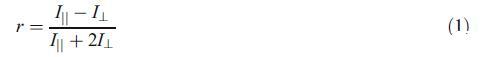所有熒光各向異性測量均在25.0±0.2°C下使用來自美國的熒光偏振儀器系統(Beacon-2000)進行。該儀器配備了100W鹵素燈作為激發源。羅丹明B(RB)作為熒光探針,其濃度保持在1μM。我們還在12mM純表面活性劑濃度下進行了10 nM至2μM探針濃度的各向異性測量(數據未顯示)。選擇飽和r值(探針完全與膠束結合)下的探針濃度(1μM)作為實驗條件。純和二元混合物的表面活性劑總濃度為12mM。分別使用570和630nm的激發和發射波長測量熒光各向異性。當發射偏振器平行或垂直于偏振激發方向定向時?,分別地各向異性是強度差IkI的比率?總強度Ikt2I?如等式1所示: