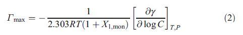 其中γ、C、R、T、P和X1、mon分別為界面張力、表面活性劑濃度、理想氣體常數、溫度、壓力和陽離子表面活性劑(HTPB)的單層組成。在等式2中,我們考慮了界面處反離子的吸附,以計算Γmax。界面上表面活性劑物種占據的平均最小面積Amin然后通過以下方程進行評估: