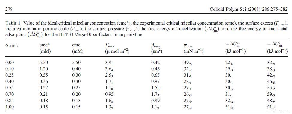 其中R、T和Xcmc分別為理想氣體常數、溫度,cmc為摩爾分數單位。表1中列出了這些值。HTPB的ΔGo m值比Mega-10更負,表明膠束形成對HTPB比Mega-10更有利。對于兩種二元混合物,由于混合cmc值變化不大,ΔGo m值保持不變。除此之外,我們還根據以下關系式[18]評估了空氣-水界面吸附的標準自由能ΔGo ad: