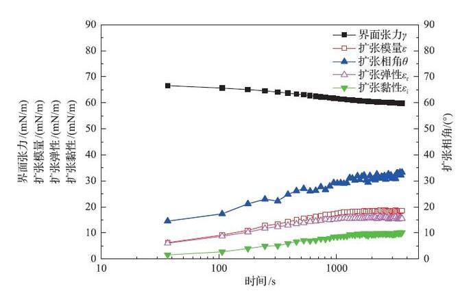 表面活性劑溶液的動態(tài)界面張力、擴(kuò)張模量、擴(kuò)張相角、擴(kuò)張彈性和擴(kuò)張黏性隨時間變化曲線