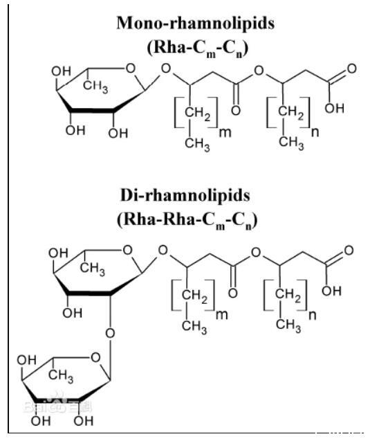 鼠李糖脂的結構多達幾十種,一般在學術界經(jīng)常看到雙鼠李糖脂和單鼠李糖脂的表述。