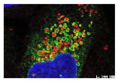 熒光顯微圖像顯示了內質網(綠色)像毯子一樣包裹住受損的溶酶體(紅色),細胞核以藍色顯示。