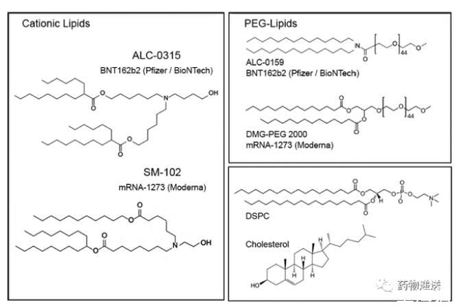 兩款mRNA疫苗采用的脂質(zhì)納米粒組成非常相似。都含有可電離的脂質(zhì),該脂質(zhì)在低pH值時(shí)帶正電利于與mRNA靜電作用絡(luò)合,在生理pH值時(shí)呈中性促進(jìn)mRNA的遞送和釋放并減少潛在的毒性。都含有聚乙二醇化脂質(zhì),以減少血清蛋白的抗體結(jié)合和吞噬細(xì)胞的清除,從而延長(zhǎng)全身循環(huán)時(shí)間。磷脂二硬脂酰磷脂酰膽堿(DSPC)和膽固醇形成穩(wěn)定結(jié)構(gòu)有助于包載mRNA。兩款疫苗的可電離陽(yáng)離子脂質(zhì):PEG-脂質(zhì):膽固醇:DSPC的摩爾比分別為46.3:1.6:42.7:9.4(Pfizer/BioNTech)和50:1.5:38.5:10(Moderna)。脂質(zhì)納米粒的粒徑為80~100nm,每個(gè)脂質(zhì)納米粒中包含有約100個(gè)mRNA分子。