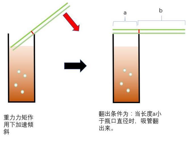 達到位置最高時,速度為零,這時,重力大于浮力,重力矩的作用下,加速傾斜。那么什么情形下,吸管會翻出來呢?顯然是吸管翻出時,不被瓶壁阻擋時,才可以翻出來。