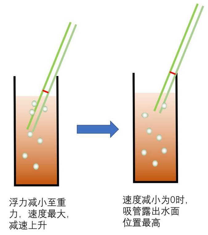 這時上升過程中,吸管可能因為左右兩側吸附的氣泡數量不同而發生浮力差異而傾斜。也可能因為外界擾動而發生傾斜,反正吸管豎直上升的可能性很小。習慣傾斜碰到瓶壁后繼續上升,上升帶來氣泡的減少,吸管自身浮力的下降。當浮力減小到小于重力時,這時開始i減速,直到速度為零。如下圖所示;