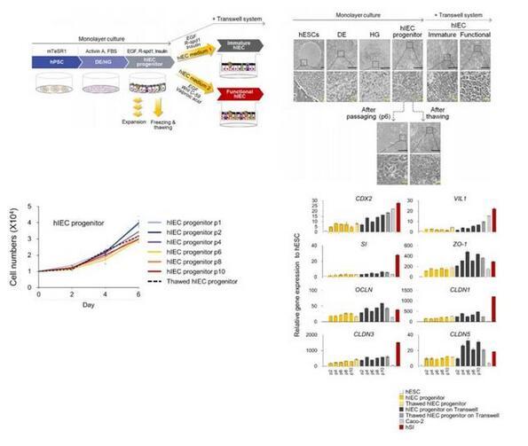 鑒于此,韓國生命工學研究院的一項研究開發了一種重復性良好的兩步方法來誘導人多能干細胞分化為可擴大的hIEC祖細胞和具有功能性的hIEC單層細胞。