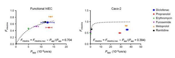 圖3|6種臨床模型藥物在功能性hIECs與Caco-2模型上吸收的擬合結果