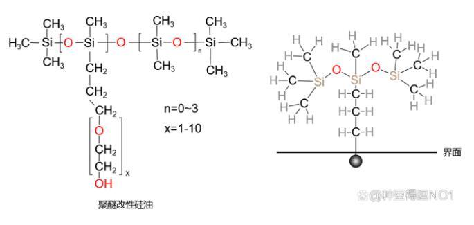 水性體系使用較多的有機(jī)硅潤濕劑一般為聚醚改性硅油,相對分子質(zhì)量較小,n=0~3,x=1~10。同時大量的CH3鏈對外伸展,極大的降低表面張力,研究表明當(dāng)親水基在鏈段中部位置時,效果最好。聚醚改性有機(jī)硅的分子結(jié)構(gòu)式和機(jī)理如上圖所示。