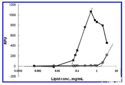 圖2.在不同濃度的脂質diC8PS下記錄的熒光發射,范圍從64μg/mL到3.47 mg/mL。在對照中,添加純DMSO代替測試化合物(O),1.1 mg/mL的急劇上升標志著diC8PS的CMC。將10μL的10 mM硫利達嗪(9)引入基質(20 mM HEPES緩沖液中的diC8PS),CMC轉移到較低濃度(0.042 mg/mL)。RFU:相對熒光單位。