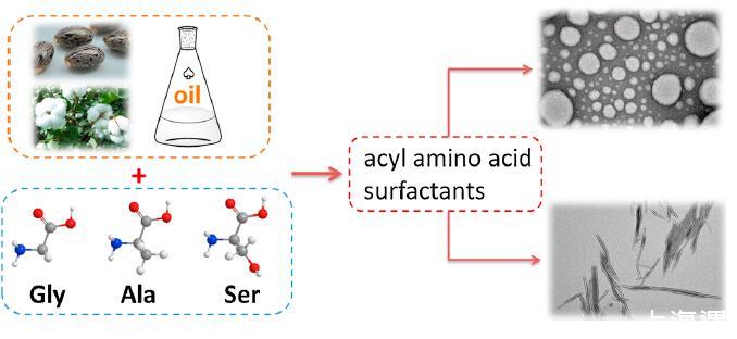 大豆油)和甘氨酸鈉[13]。在目前的工作中,我們以甘氨酸、丙氨酸和絲氨酸殘基為頭基合成了六種新的以蓖麻油和棉籽油為原料的N-酰基氨基酸表面活性劑。蓖麻油是一口井-在第12個碳上帶有羥基的蓖麻油酸的已知來源,已被用作食品、醫藥[14,15]、表面涂層[16]和潤滑劑[17]的添加劑。另一方面,棉籽油常用作煎炸油,含有大量不含羥基的不飽和脂肪酸。我們研究并比較了這兩種植物油合成的表面活性劑的界面活性和組裝行為,以期揭示羥基的作用。值得注意的是,囊泡形成與表面活性劑結構上羥基的存在有關,囊泡的形態取決于羥基的位置。
