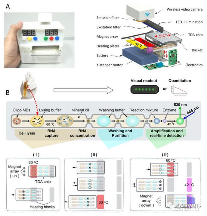 圖1液滴陣列微流控芯片核酸分析系統。A.分析儀器實物及結構示意圖;B.分析原理示意圖。