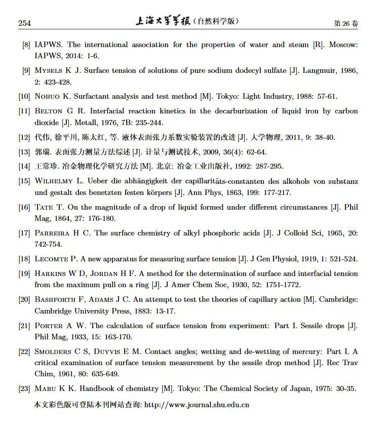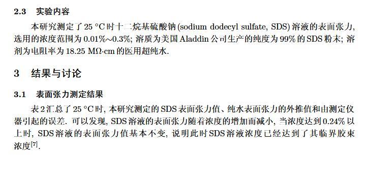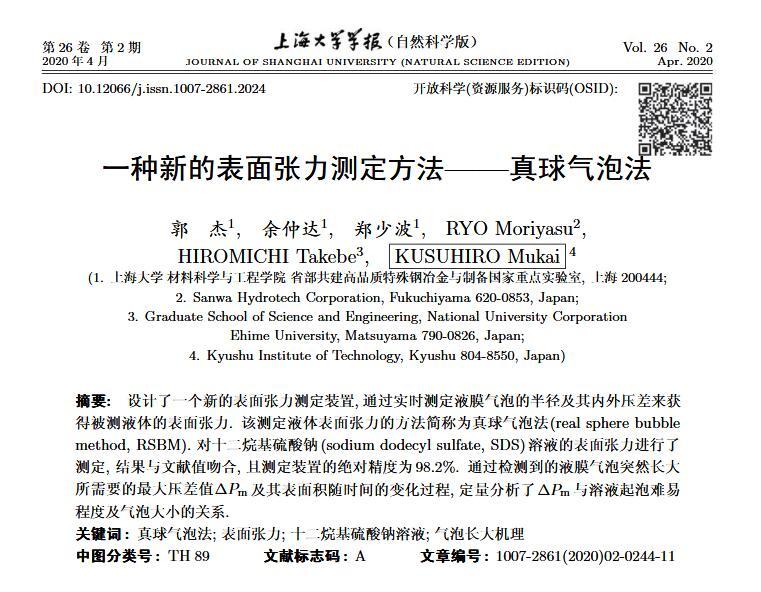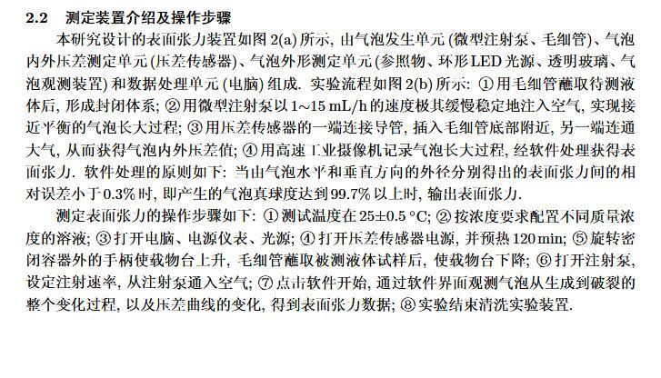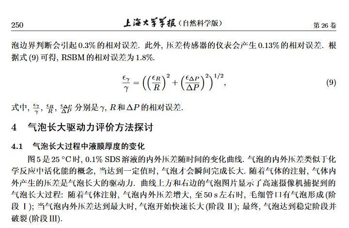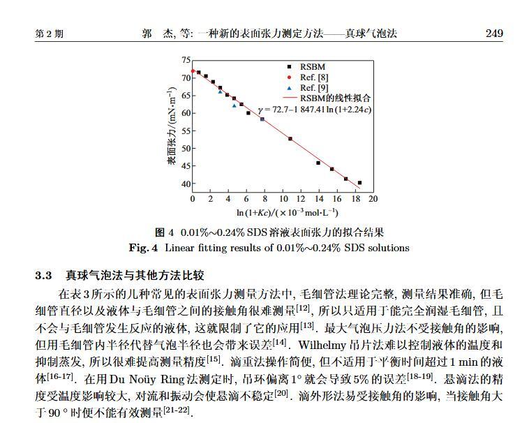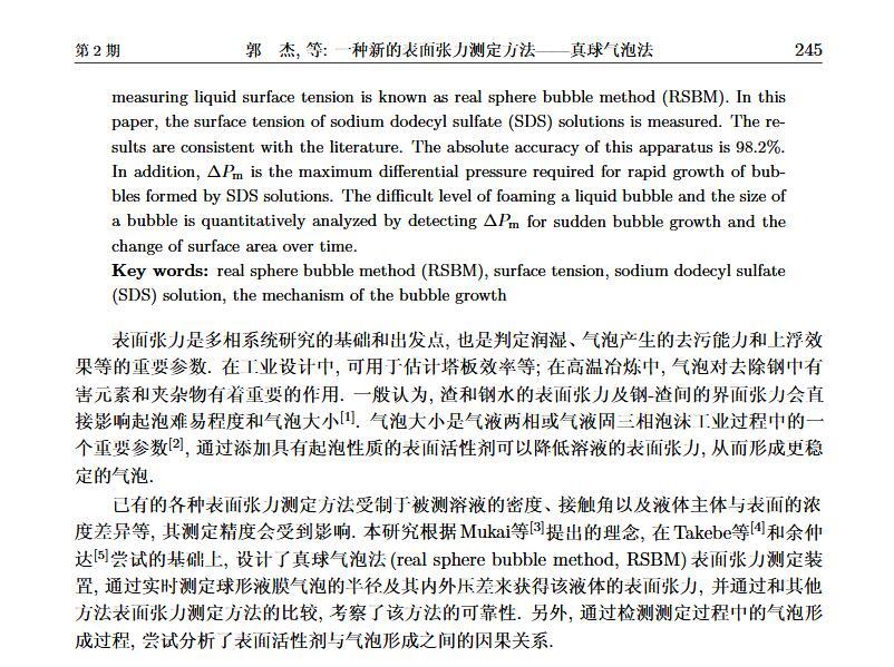設計了一個新的表面張力測定裝置,通過實時測定液膜氣泡的半徑及其內外壓差來獲得被測液體的表面張力。該測定液體表面張力的方法簡稱為真球氣泡法(real sphere bubblemethod,RSBM)。對十二烷基硫酸鈉(sodium dodecyl sulfate,SDS)溶液的表面張力進行了測定,結果與文獻值吻合,且測定裝置的絕對精度為98.2。通過檢測到的液膜氣泡突然長大所需要的最大壓差值及其表面積隨時間的變化過程,定量分析溶液起泡難易程度及氣泡大小的關系。