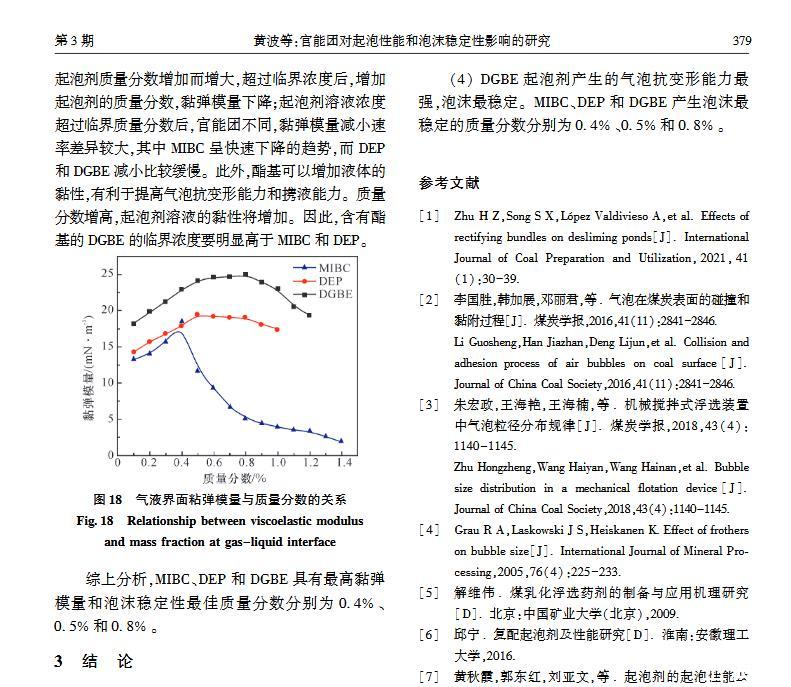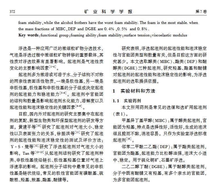 【摘要】:浮選是分離微細物料的重要方法,起泡劑類型和泡沫穩定性顯著影響浮選效果。本文選取醇類(MIBC)、酯類(DEP)和醚醇類(DGBE)三種起泡劑,通過實驗研究官能團對起泡性能和泡沫穩定性的影響。實驗用Foamscan測定起泡劑溶液的起泡性能和泡沫穩定性,用Tracker流變儀測定表面張力和氣液界面黏彈模量。研究結果表明:起泡速率隨表面張力的減小呈線性增大,當氣液界面吸附起泡劑達到飽和時起泡速率最大,其中MIBC的起泡速率最高,DGBE最小;起泡劑濃度為臨界質量分數時,起泡能力最大,MIBC、DEP和DGBE的臨界質量分數分別為1.1%、0.4%和0.8%;氣泡的大小隨溶液表面張力減小而減小,氣泡平均尺寸由大至小順序為:DGBEDEPMIBC;在泡沫穩定性方面,醚醇類起泡劑最強,醇類起泡劑最差,同時MIBC、DEP和DGBE質量分數分別為0.4%、0.5%和0.8%時,起泡劑生成的泡沫最穩定。