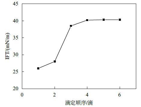 結(jié)果表明,液滴懸置5 min后,第一滴液滴表面張力值最小,隨著連續(xù)滴定的進行,液滴表面張力值逐漸增大,最終趨于平衡。究其原因,可能是由于懸置一段時間后,表面活性劑分子在表面充分吸附,所以第一滴液滴表面張力最小,而隨著連續(xù)滴定進行,由于平衡時間較短,表面活性劑分子在液滴的表面吸附未達(dá)平衡,所以數(shù)值逐漸增大,然而滴加液滴的速度一定,表面活性劑分子在表面的遷移速率一定,降低表面的能力與效率一定,最終會達(dá)到一個穩(wěn)定值。而平衡時間的長短,與表面活性劑分子的性質(zhì)有關(guān),遷移吸附速率快的表面活性劑分子所需時間較短。由此可見,使用懸滴法測定表面張力時,時間效應(yīng)的影響不可忽略。