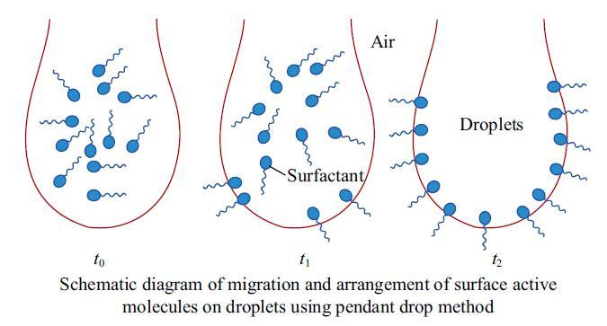 結(jié)果表明,在動態(tài)表面張力曲線圖中,A,B,C三種樣品在60 mg/kg的較低含量下,表面張力均呈現(xiàn)先快速降低而后緩慢降低最終達(dá)到平衡的趨勢,表明表面活性劑分子在液滴表面上確實存在著隨時間變化逐漸吸附平衡,排列完整的現(xiàn)象,如圖4所示,表面活性劑分子在表面完全吸附、排列緊密需要一定的時間,顯然在使用懸滴法進行測定時,時間效應(yīng)直接影響著表面張力測定的誤差大小,符合前文所述結(jié)論。而樣品B在100 mg/kg含量下,動態(tài)表面張力趨勢圖成一條直線,證明該種表面活性劑在液滴表面遷移速度較快,在液滴完全注射形成之前已快速到達(dá)平衡狀態(tài),表面活性劑分子在表面得以充分排布,這解釋了較低含量的表面活性劑溶液的靜態(tài)表面張力與國標(biāo)推薦方法吻合程度差異較大的原因。這是由表面活性劑分子自身性質(zhì)所決定的,與其極性基的類型、結(jié)構(gòu)、個數(shù)、疏水基長度等息息相關(guān)。而單一液體,未具有含量差,故不存在表面活性劑分子從溶劑內(nèi)部遷移吸附至表面這一過程,所以其動態(tài)表面張力曲線呈現(xiàn)為平穩(wěn)直線。