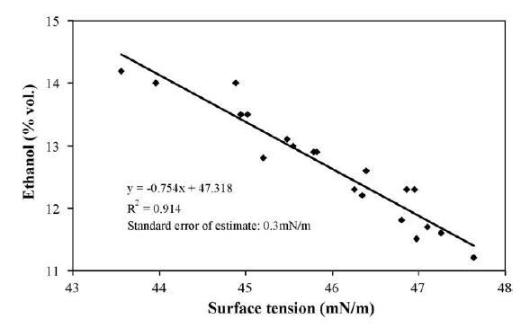 如統計分析所示,乙醇、單寧和蛋白質是與表面張力最相關的三個參數。 一方面考慮到它們在釀酒學上的重要性,另一方面考慮到它們的測定方法費力,我們使用回歸分析研究了各種數學模型,目的是通過簡單的表面測量獲得評估其濃度水平的預測模型。緊張。 正如預期的那樣,最適合的模型用于估計乙醇含量。 描述它的散點圖和線性方程如圖 2 所示。該模型將乙醇濃度的變化解釋為 91.4%,估計的標準誤差等于 0.3 mN/m。