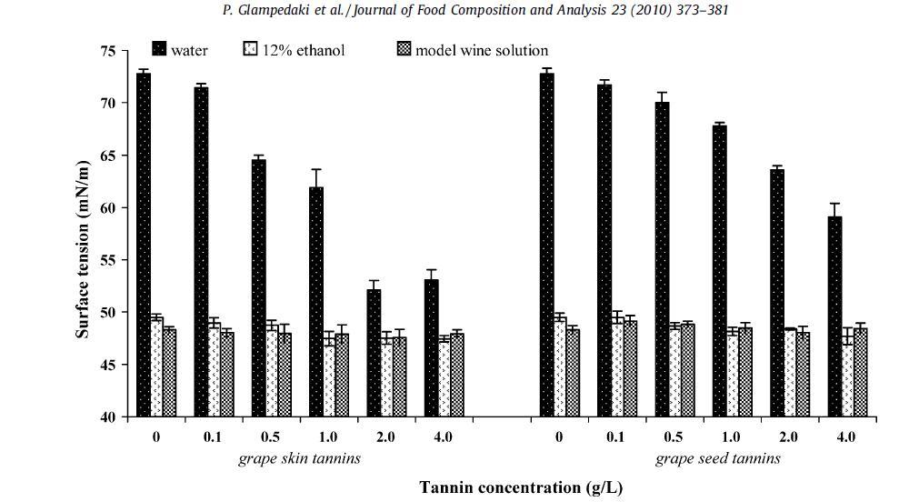 為了突出葡萄酒主要成分對表面張力的影響,制備了乙醇、蛋白質和單寧標準溶液,并在三種不同的基質中測定了它們的表面張力:水、水/乙醇混合物(12%,v/v 乙醇)和模型葡萄酒溶液(12%,v/v 乙醇,2 g/L 酒石酸,pH 3.5)。 研究的濃度在通常在葡萄酒中發現的范圍內。 選擇 BSA 作為參考蛋白質,代表表面活性蛋白質。 眾所周知,BSA 具有與廣泛使用的表面活性劑十二烷基硫酸鈉 (SDS) 相當的優異發泡性能(Razafindralambo 等,1996)。 結果如表 1 所示。使用市售的釀酒單寧(從葡萄皮和種子中提取的單寧的天然混合物),因為它們被認為是葡萄酒中天然存在的單寧的代表。 結果如圖1所示。