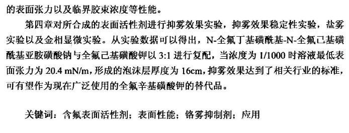 第四章對所合成的表面活性劑進行抑霧效果實驗,抑霧效果穩定性實驗,鹽霧實驗以及金相顯微實驗。從實驗數據可以得出,N-全氟丁基磺?;?N-全氟己基磺?;鶃啺坊撬徕c與全氟己基磺酸鉀以3:1進行復配,當濃度為1/1000時溶液最低表面張力為20.4mN/m,形成的泡沫層厚度為16cm,抑霧效果達到了相關行業的標準,可有望作為現在廣泛使用的全氟辛基磺酸鉀的替代品。