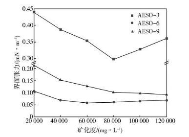 從圖2可以看出,隨著礦化度的增加,AESO-3的界面張力先降低后升高,AESO-6和AESO-9界面張力降低到平衡值后基本保持穩(wěn)定,在礦化度達到120 000 mg/L時界面張力仍能達到10-2mN/m數(shù)量級,這說明EO聚合度的增加提高了脂肪醇聚醚磺酸鹽的耐鹽性能。這一現(xiàn)象可以用無機鹽對表面活性劑在溶液中的聚集形態(tài)的影響來解釋[15]。通常表面活性劑中的雙親基團各自趨向于自身親和力強的溶液中,在油水界面規(guī)則排列形成一層親水基向外、憎水基向內(nèi)的薄層,溶液中濃度達到一定時,表面活性劑分子發(fā)生聚集形成膠束。加入適量無機鹽,無機鹽正離子受靜電作用會在親水基附近聚集能夠降低親水基之間的靜電排斥、改變表面活性劑在界面的堆積形態(tài),從而降低油水界面張力;隨著無機鹽濃度繼續(xù)增大,無機鹽離子對表層進一步壓實,油相無法進入膠束中導(dǎo)致界面張力增大。而對于非離子-陰離子表面活性劑,中性親水基團EO的引入減弱了無機鹽對界面親水基的靜電作用,從而使其在礦化度較高的時候仍然能夠保持良好的界面活性。