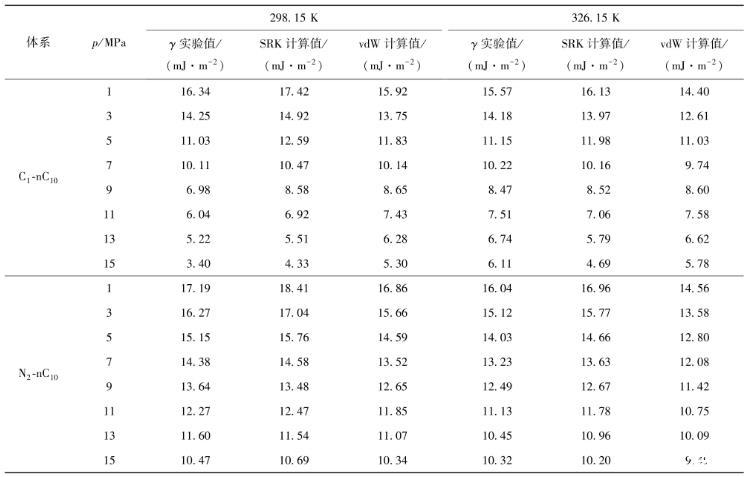 Zhang等[11]設計出納米實驗裝置,并測量甲烷-正葵烷(C1-nC10)和氮氣-正葵烷(N2-nC10)混合物在納米孔(rp=50 nm)中的界面張力,其具體測量值見表1。對比實驗測量的界面張力與模型預測值,是檢驗建模正確性的重要方法之一。因此,筆者對不同溫度下的C1-nC10和N2-nC10混合物的界面張力進行預測,其使用到的純組分狀態(tài)方程參數(shù)列于表2。