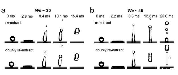 由于較低的表面張力,油滴很容易在固體表面鋪展潤濕,從而降低整個體系的界面自由能,因此,實現低表面扎張力的超排斥相對來說比較困難。為了實現低表面張力油的超排斥,目前有相關研究人員提出了雙內凹結構,通過雙內凹結構能夠有效鎖定固-液-氣三相接觸線,阻止液體沿著表面微結構向下滑移,從而將液體支撐在微結構空氣層上面而實現對不同液體的有效排斥。