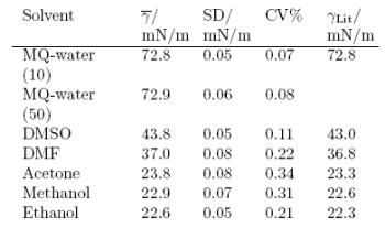 下表列舉了幾種廣為人知的溶劑的表面張力數(shù)據(jù)來闡述了Kibron傳感器的準(zhǔn)確性和精確性,每種溶劑都連續(xù)測定5次并且利用常規(guī)的統(tǒng)計(jì)學(xué)方法來分析相關(guān)數(shù)據(jù)。對表面張力的均值進(jìn)行了一個比較,結(jié)果和文獻(xiàn)值是相一致的。